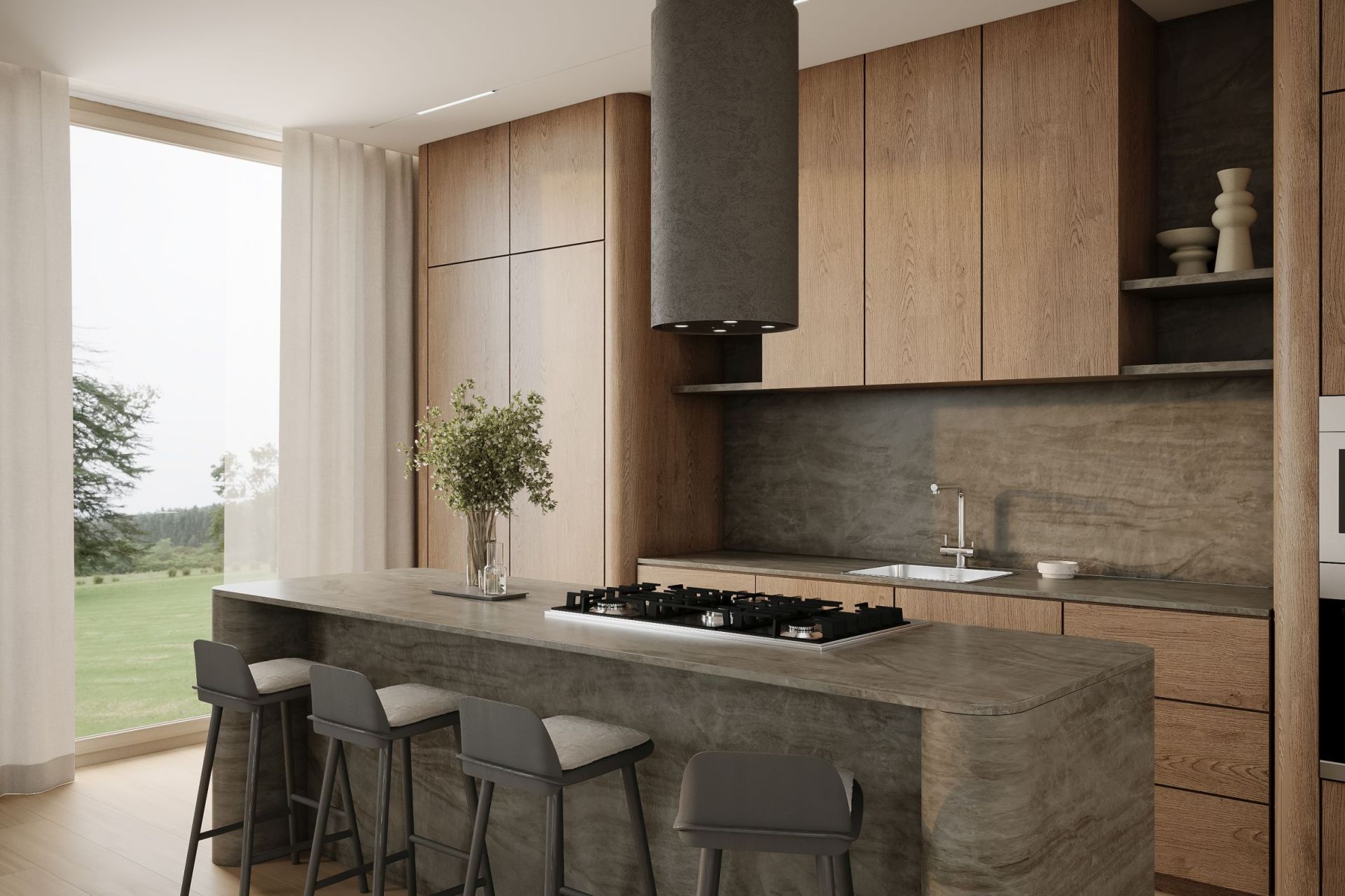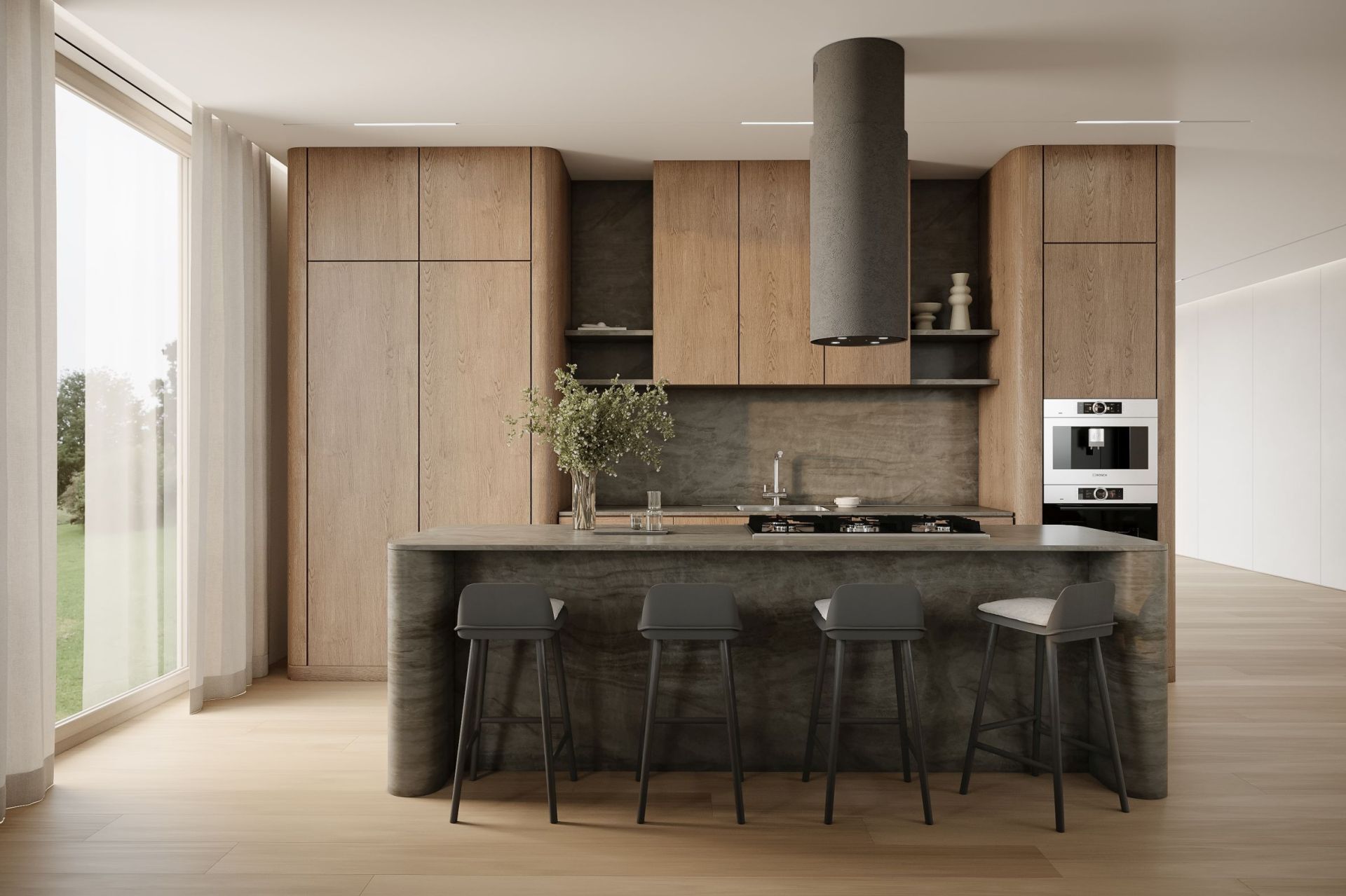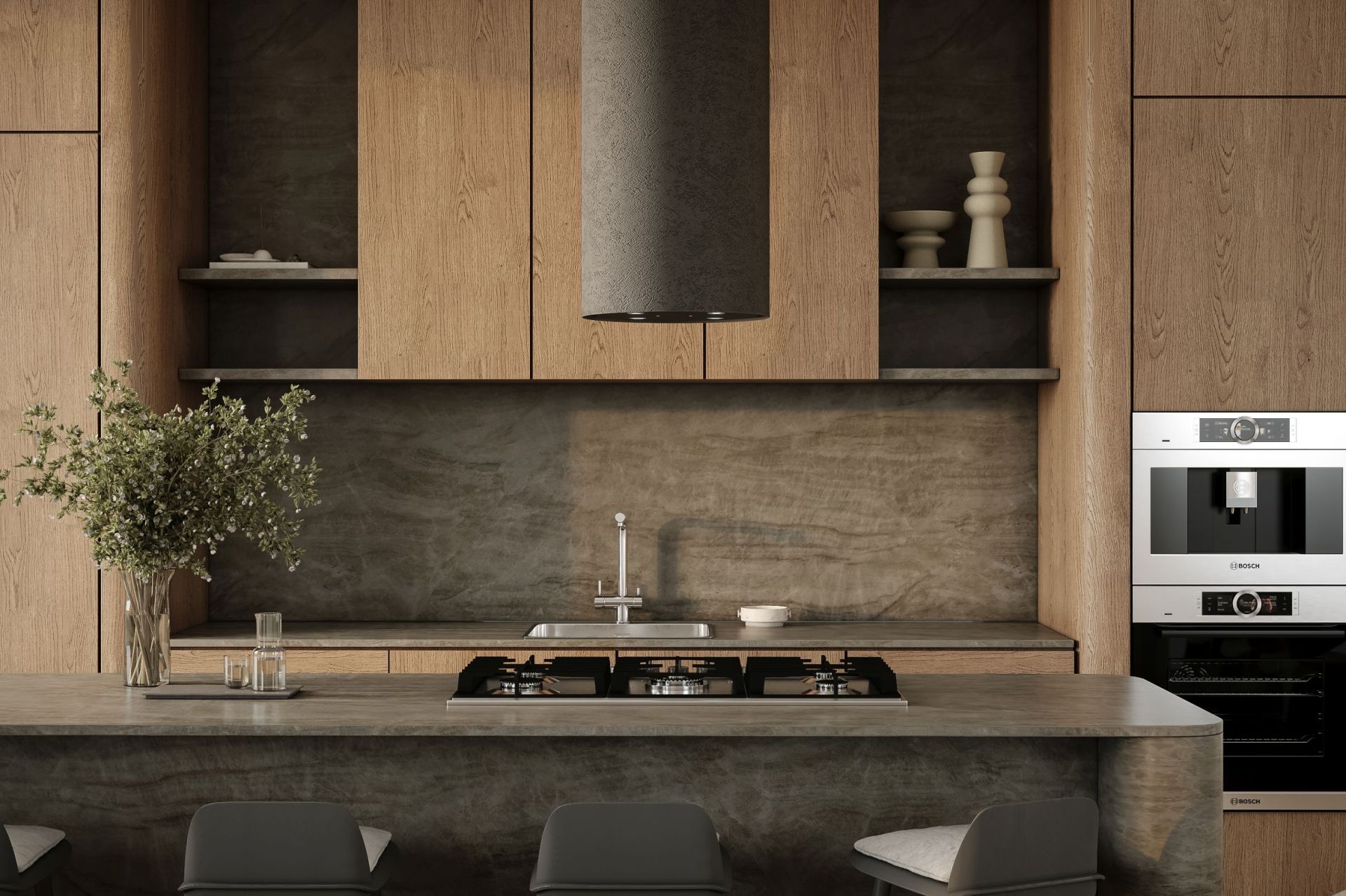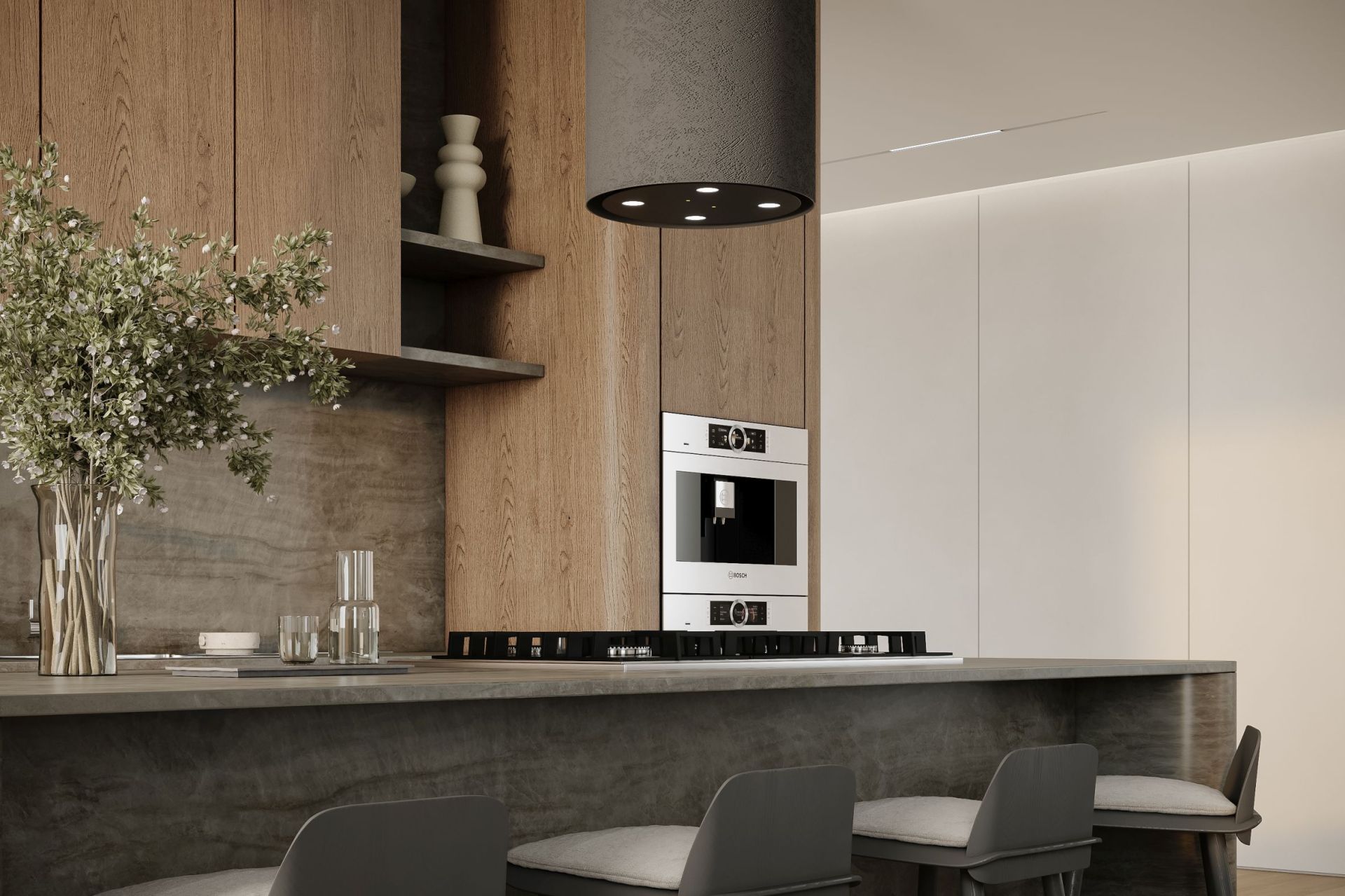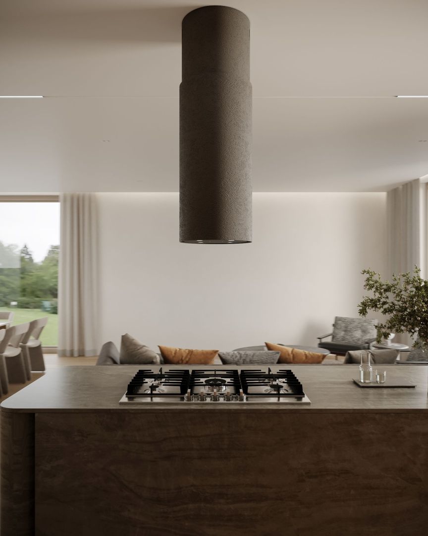 Темно-серая бетонная вытяжка оснащена контрастным черным стеклянным плафоном, подчеркивающим выразительность цвета и индустриальный характер модели. Нежная элегантность в сочетании с отличной функциональностью делает Columni Stono Dark Grey идеальным выбором для современных интерьеров, придавая им изысканный стиль. Благодаря тонкому, 2-3 мм слою покрытия, конструкция остается легкой и удобной в монтаже.