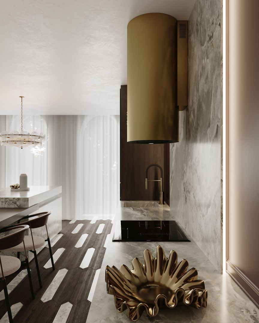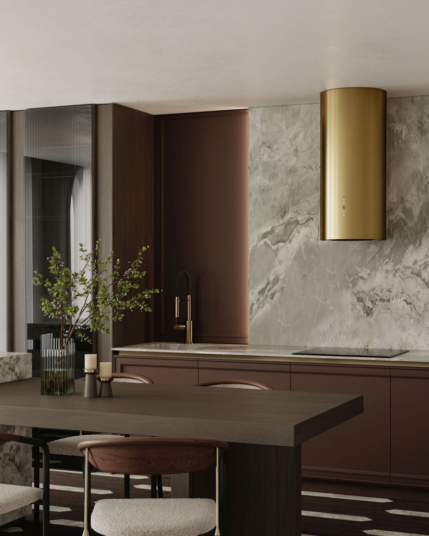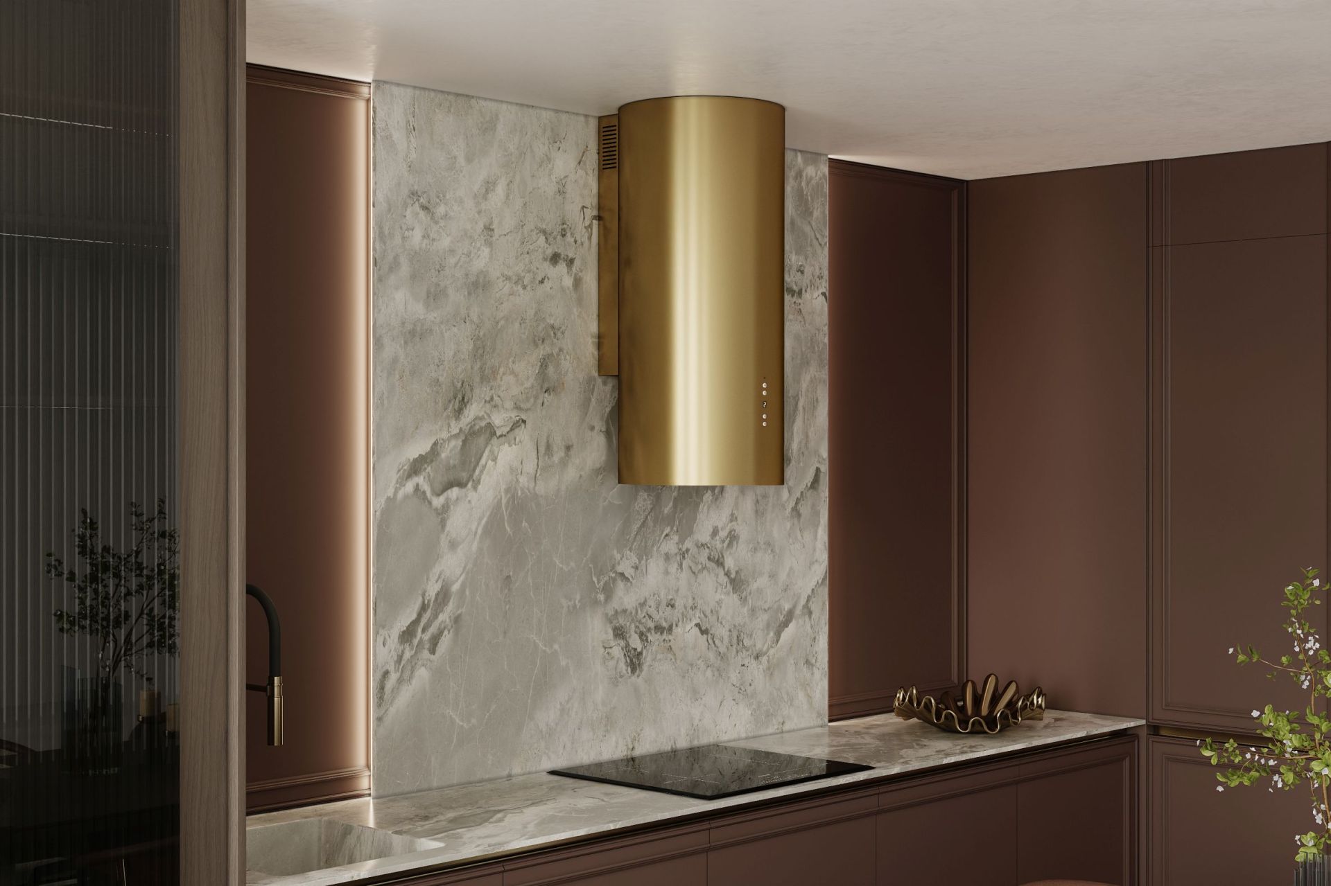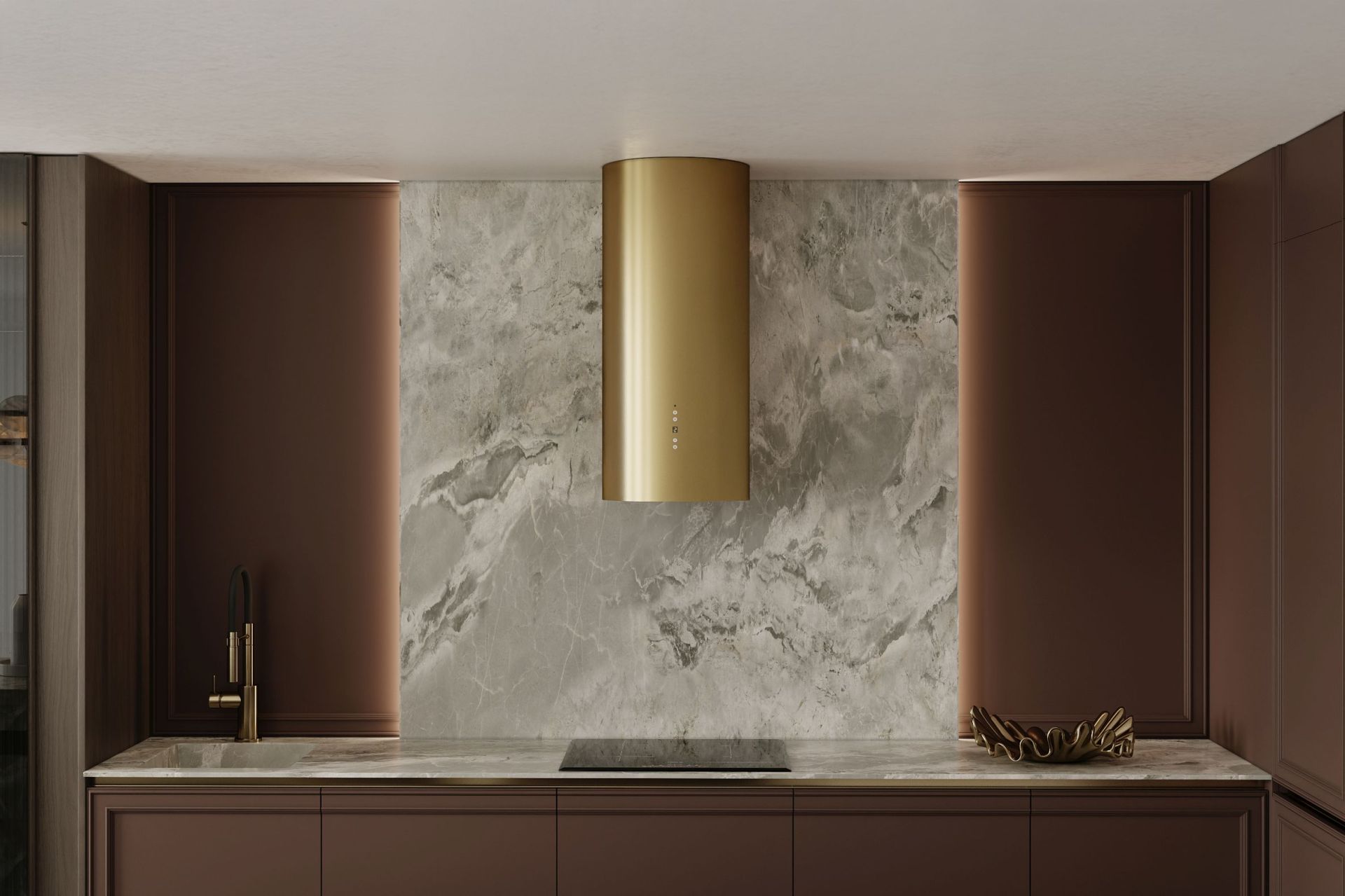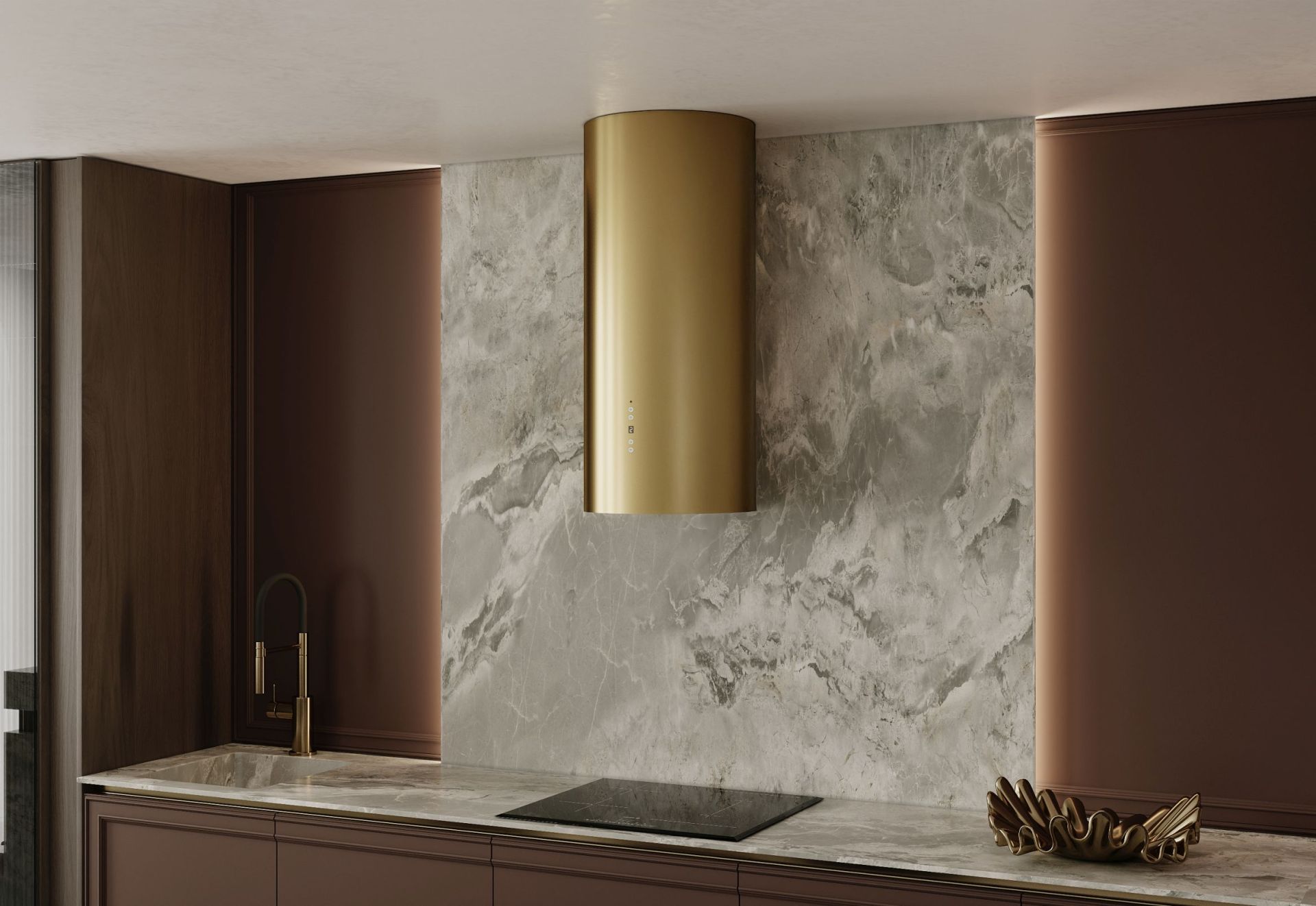 «В изысканной кухне цилиндрическая настенная вытяжка в цвете золота парит как скульптура воздуха и света, сдержанная и в то же время доминирующая».