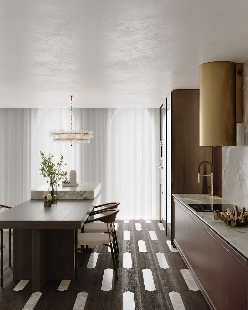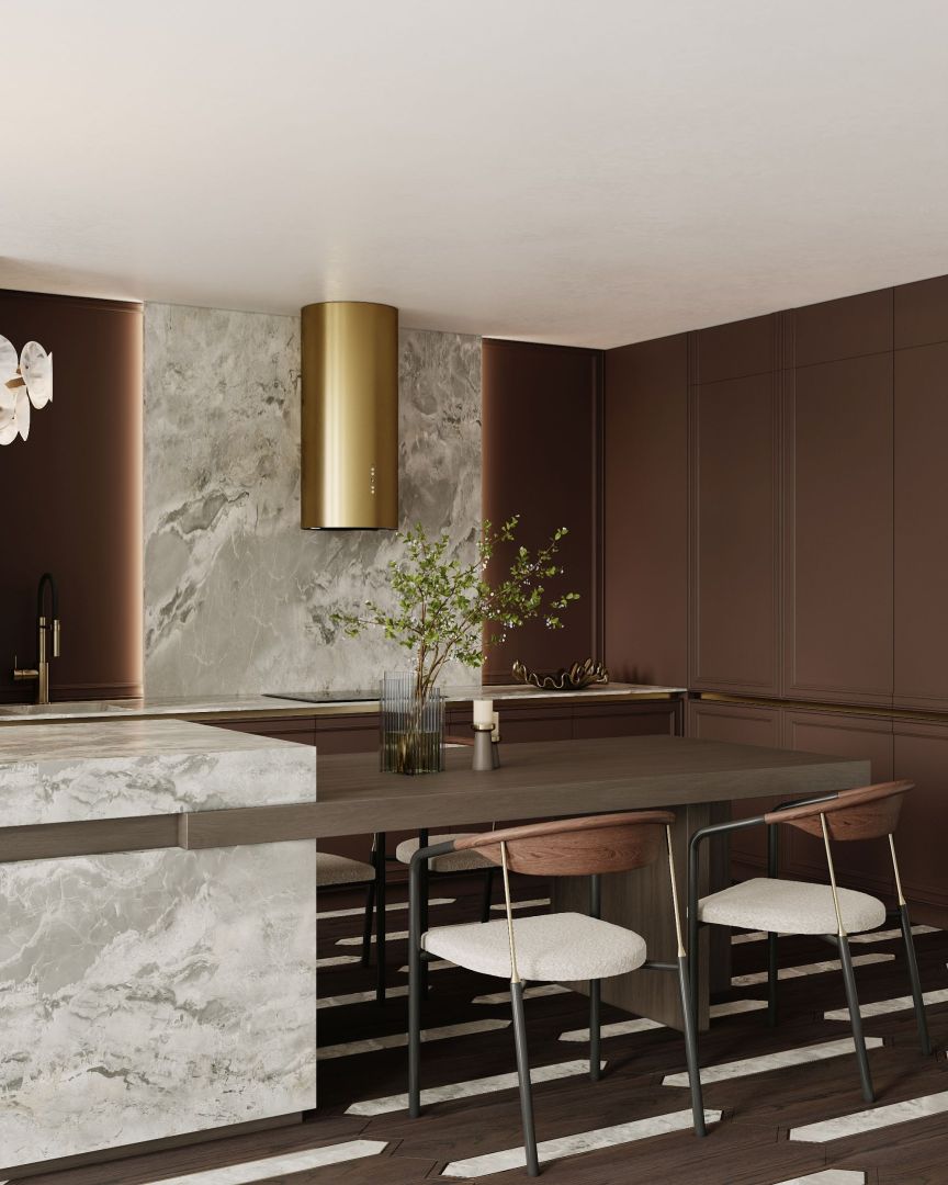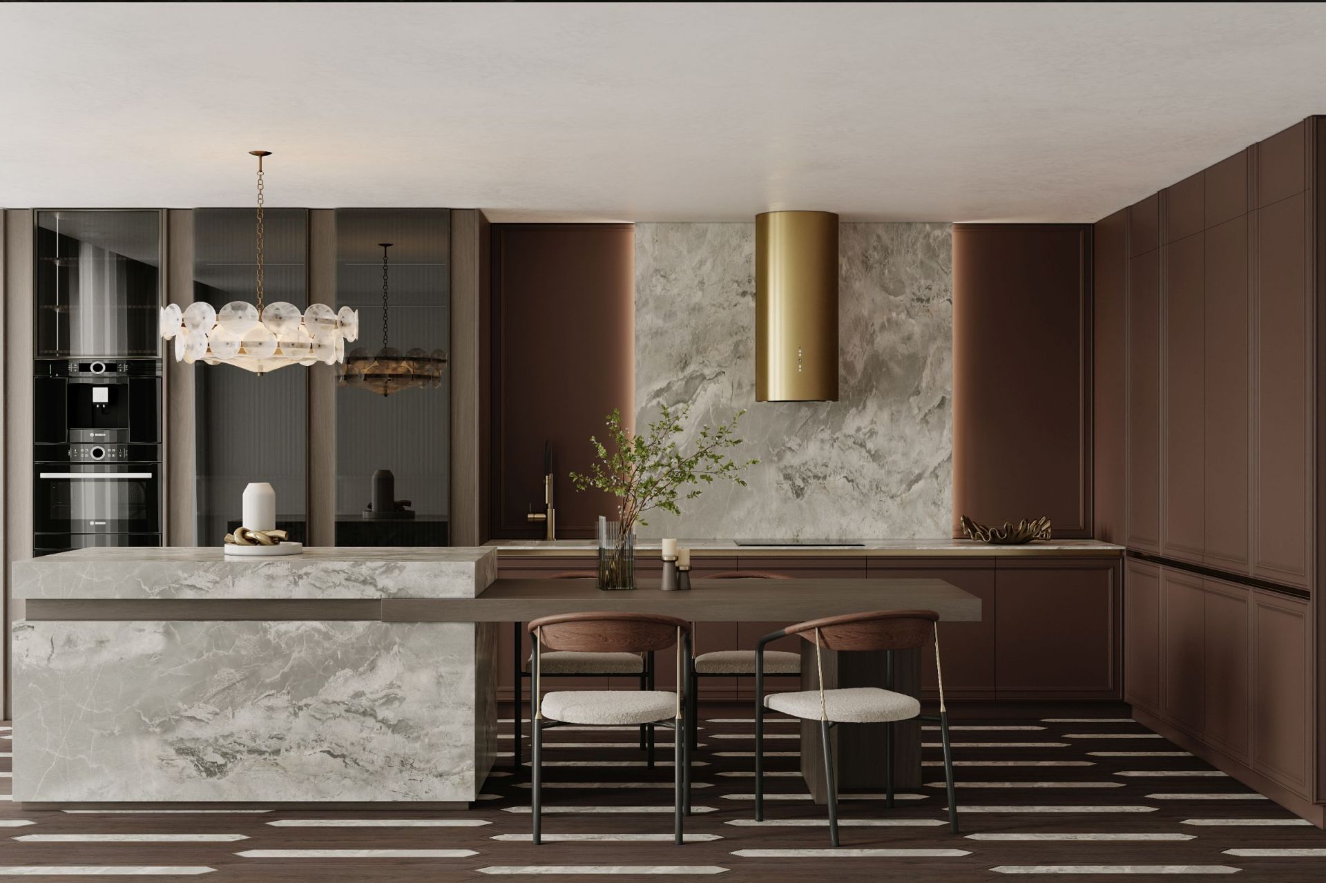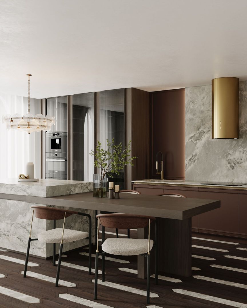 Современные и более теплые по стилю кухни: modern classic, mid-century, japandi luxe, minimal glam.